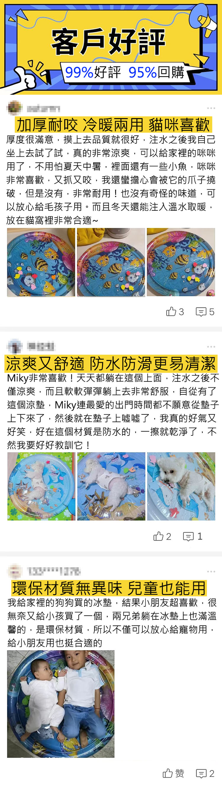 4分鐘前【冷暖兩用!夏季直降7℃,冬季可加溫水40℃!環保防滑材質,無異味更安心,充氣注水軟彈舒適,貓狗四季通用!兒童可用】寵物大水床 超大直徑 玩趣圖案 寵物孩子都可躺可玩耍 - 【65cm,2組入】划算,每個均價不到550!僅需1099