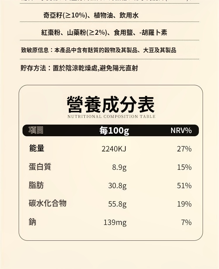 融合奇亞籽之高纖維、富含不飽和脂肪酸,紅棗補血益氣,山藥健脾益胃,椰子營養豐富。此薄脆美味可口,是健康零食佳選。無論代餐或平日享用,皆能為你提供充足能量,滋補身心。